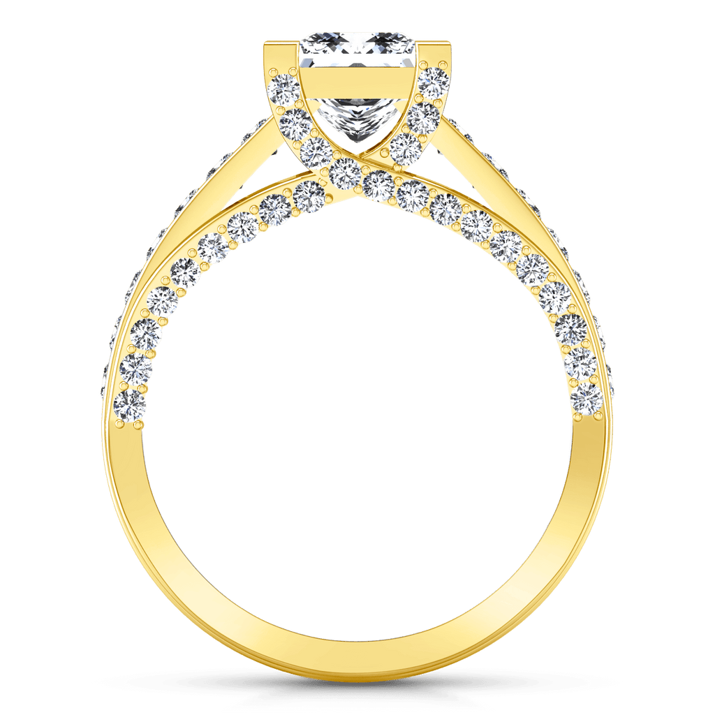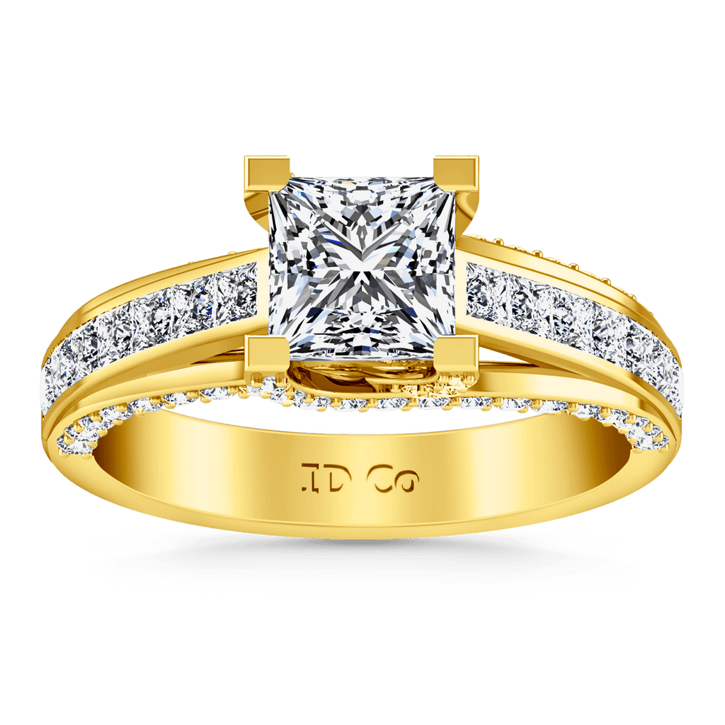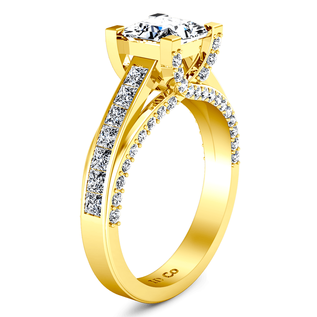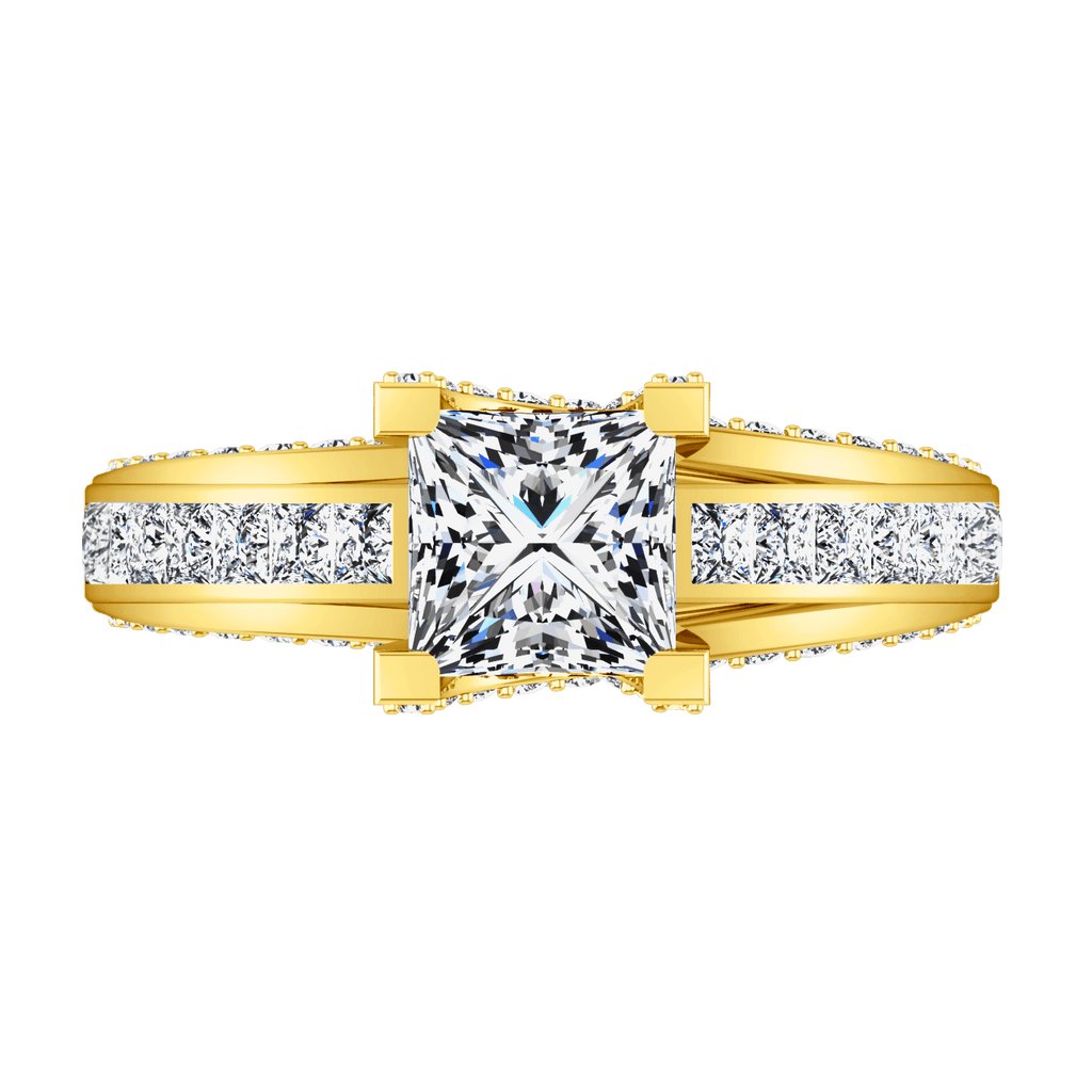 This ring features shimmering accent stones set besides your glamorous princess cut center stone and even more sparkling diamonds set into the lattice create a splendid ring that will be come a timeless heirloom to treasure. Featured with 0.89 carats of pave diamonds in 14k yellow gold with an average width of 3mm . This ring is fully customizable, so pick your center diamond size, color and clarity and we will custom build it for you.