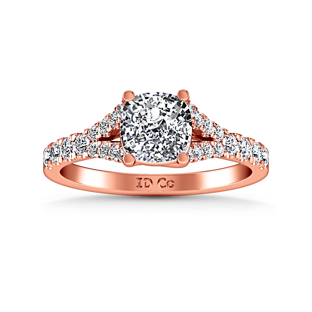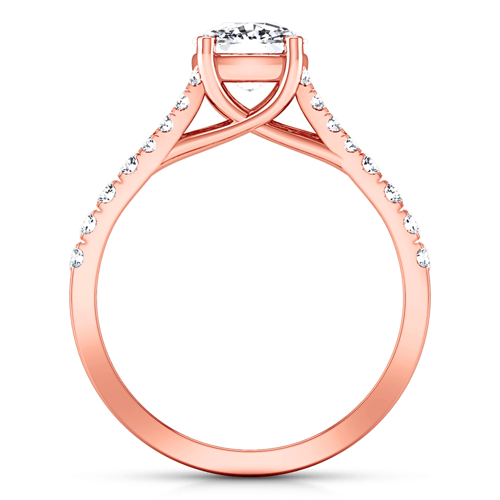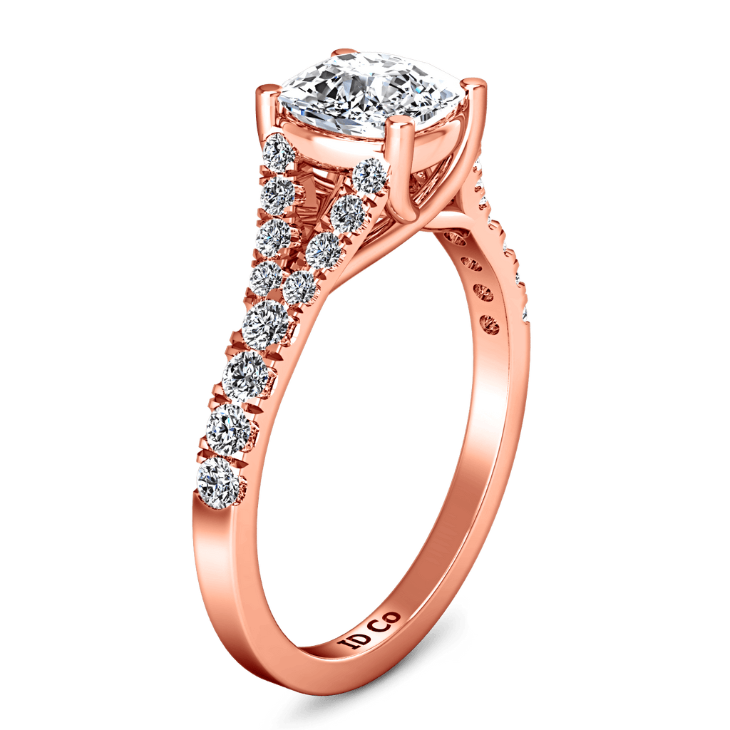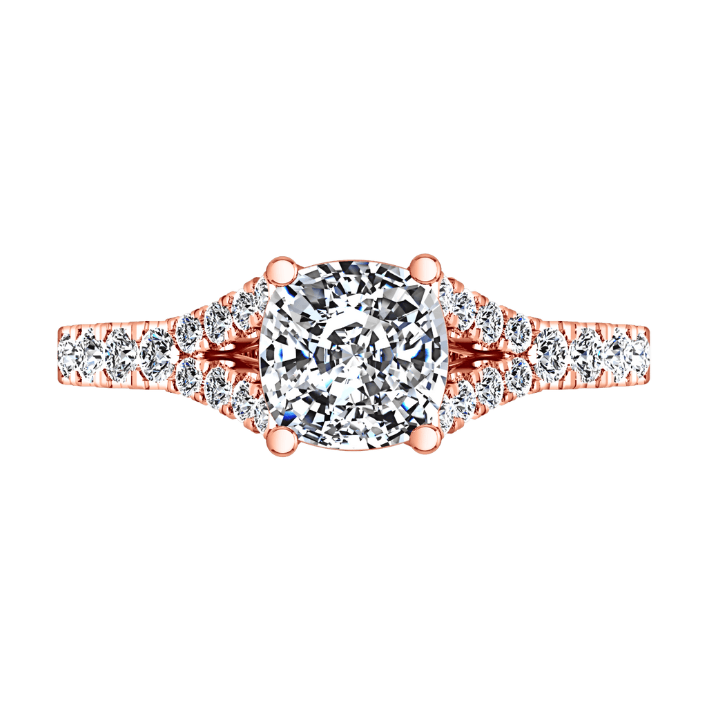 Petitie and charming diamond accent stones are set in a split mounting with lattice style prong engagement ring. Featured with 0.6 carats of pave diamonds in 14k rose gold with an average width of 2mm . This ring is fully customizable, so pick your center diamond size, color and clarity and we will custom build it for you.