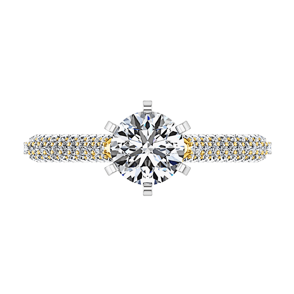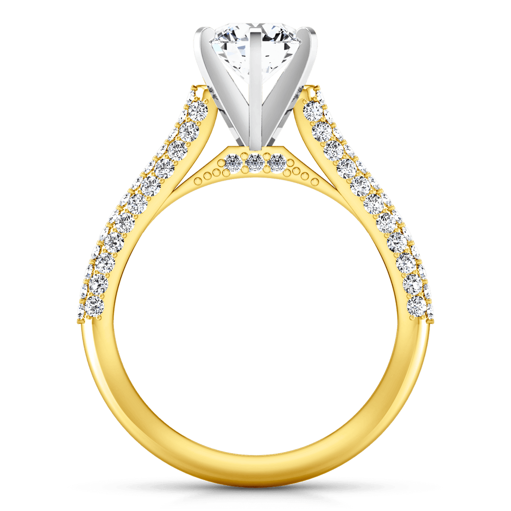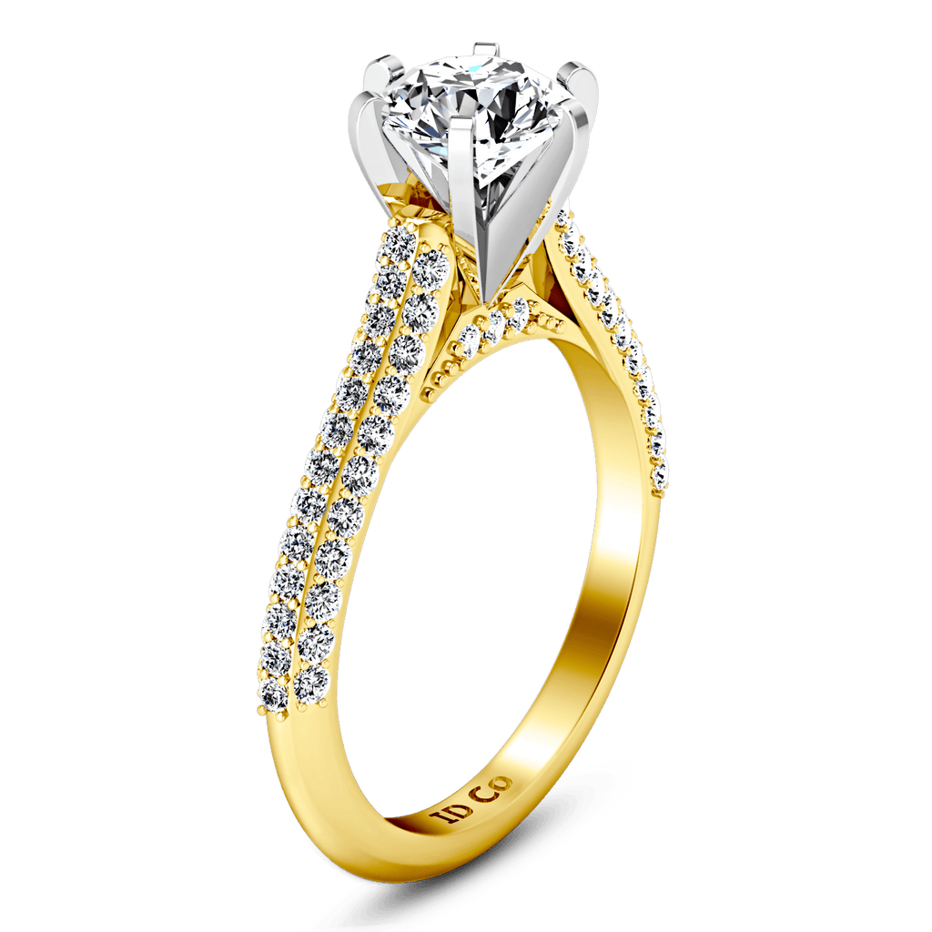 This opulent ring is beautiful and elegant with side stones that accentuate your dazzling center diamond in this cathedral style setting. Featured with 0.77 carats of pave diamonds in 14k yellow gold with an average width of 2mm . This ring is fully customizable, so pick your center diamond size, color and clarity and we will custom build it for you.