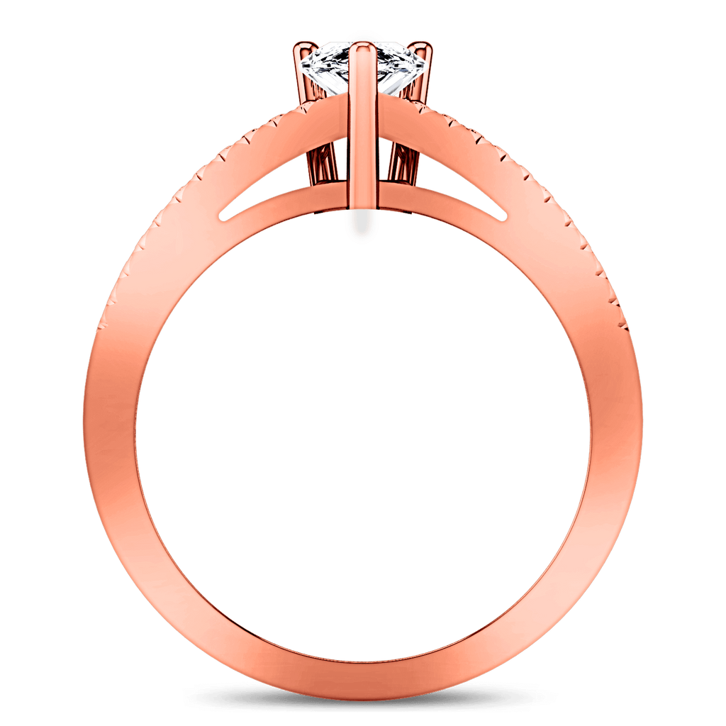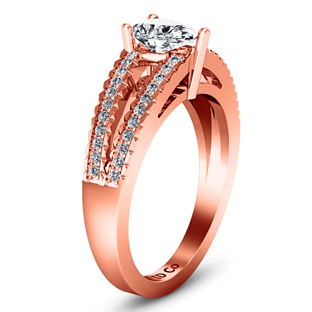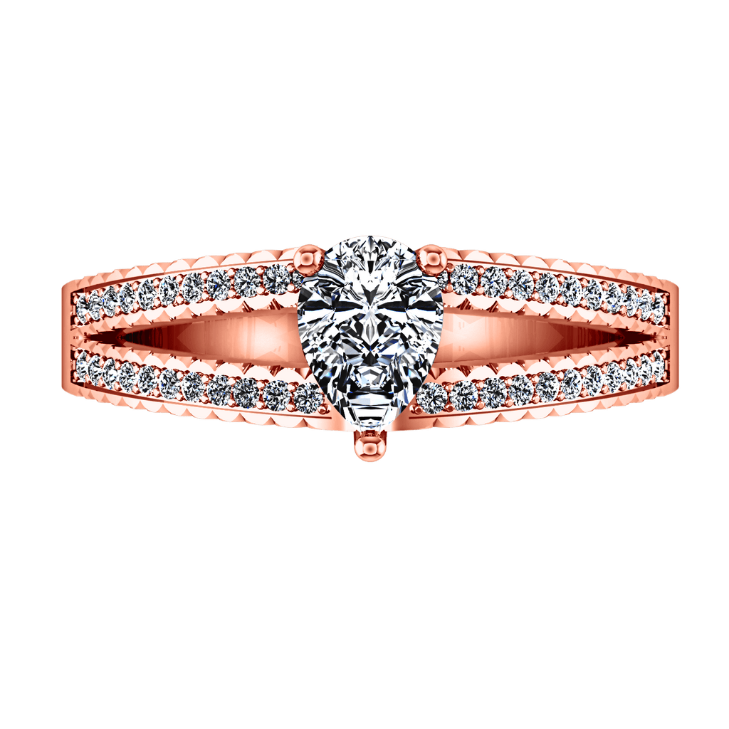 Your elegant pear shaped center stone will be highlighted by a split diamond set mounting that is sure to become an instant classic. Featured with 0.44 carats of pave diamonds in 14k rose gold with an average width of 2mm . This ring is fully customizable, so pick your center diamond size, color and clarity and we will custom build it for you.