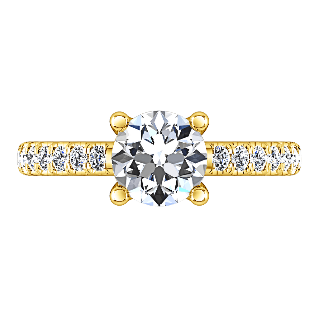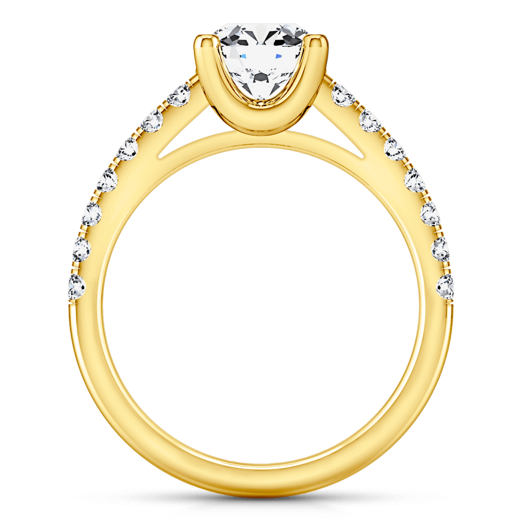This setting features a modern four prong mounting with trapezoid diamond side stones that creates a flattering look. Featured with 0.45 carats of pave diamonds in 14k yellow gold with an average width of 2mm . This ring is fully customizable, so pick your center diamond size, color and clarity and we will custom build it for you.
