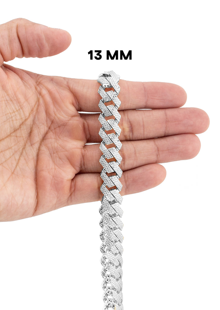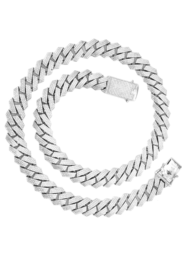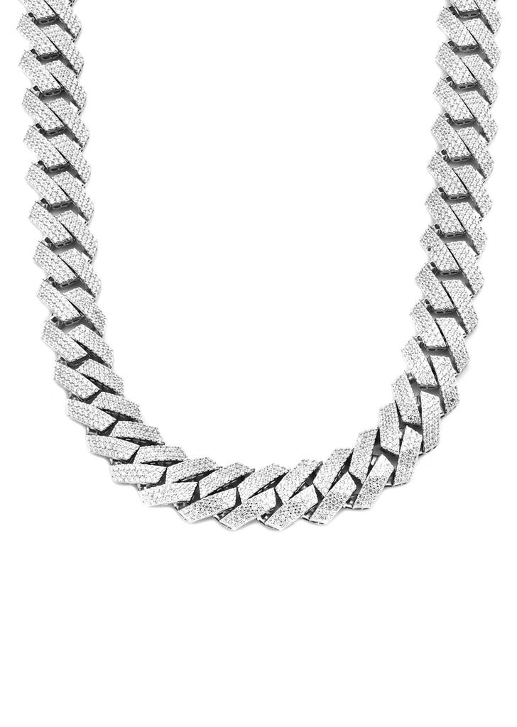 Pure Silver (925) Hollow White Gold Iced Out Prong Cuban Link Chain in 13 mm with Rhodium bonded 6 times to provide optimum quality and durability. These chains are fully customizable, so you can pick your length above. Once you select your length, you can see the adjusted gram weight below the price. The chain is also water proof which will provide long lasting wear under any condition.