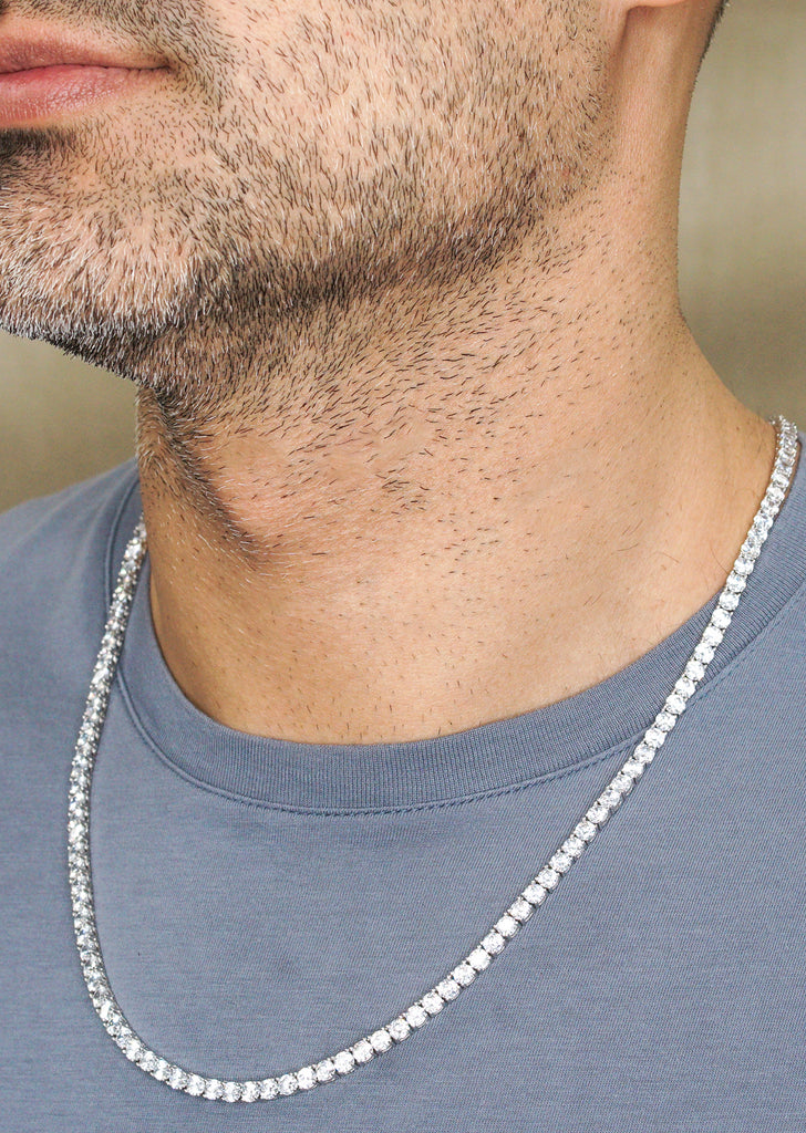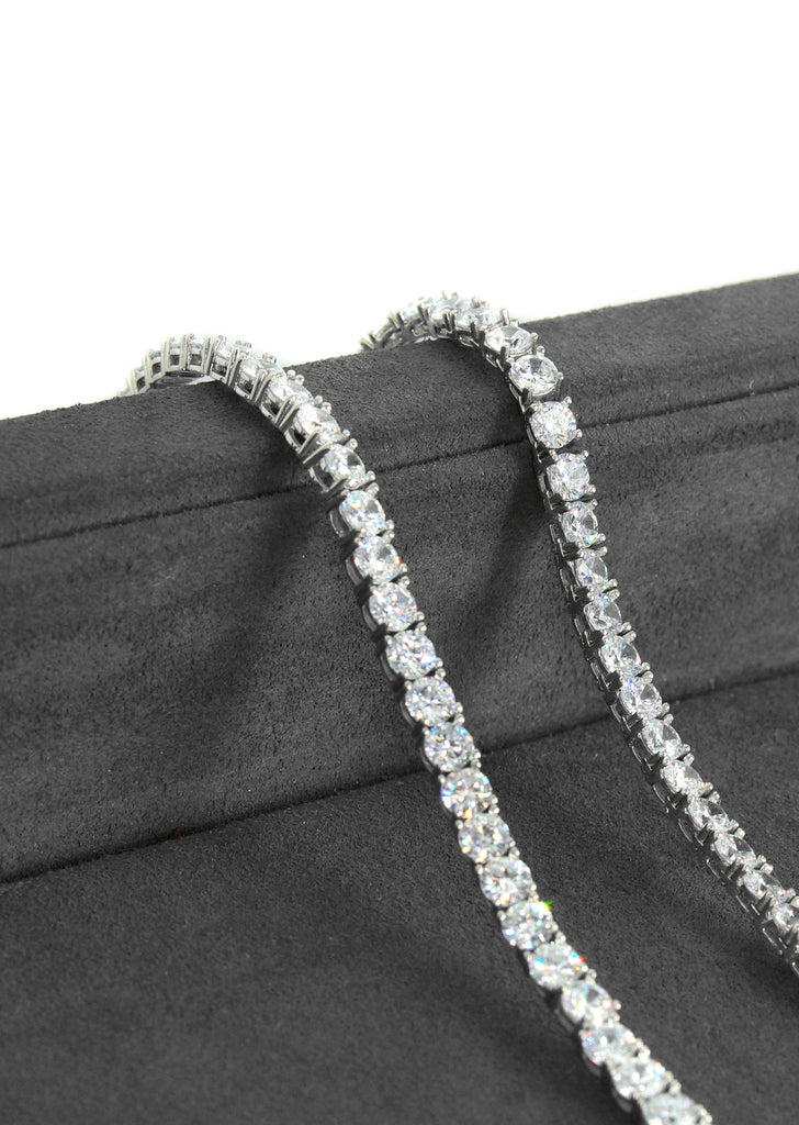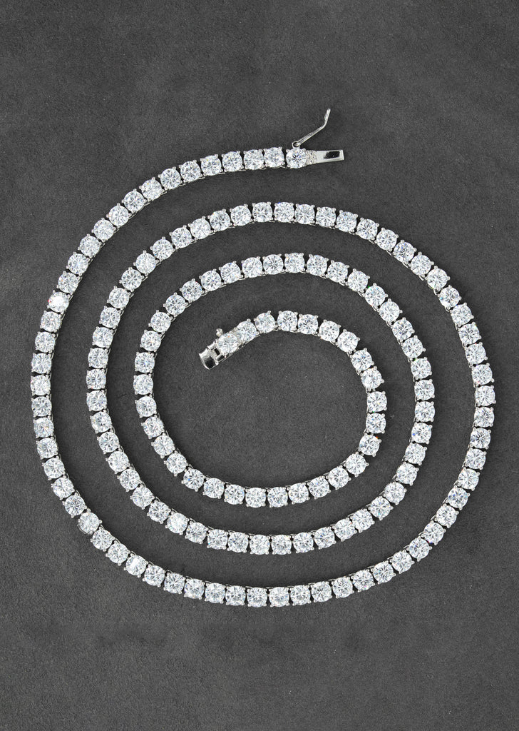 Pure 925 Silver Tennis Chain in 4mm which has been gold bonded over 6 times with Rhodium for premium quality and durability. These chains are fully customizable, so you can pick your length above. Once you select your length, you can see the adjusted gram weight below the price. The chain is also water proof which will provide long lasting wear under any condition.
