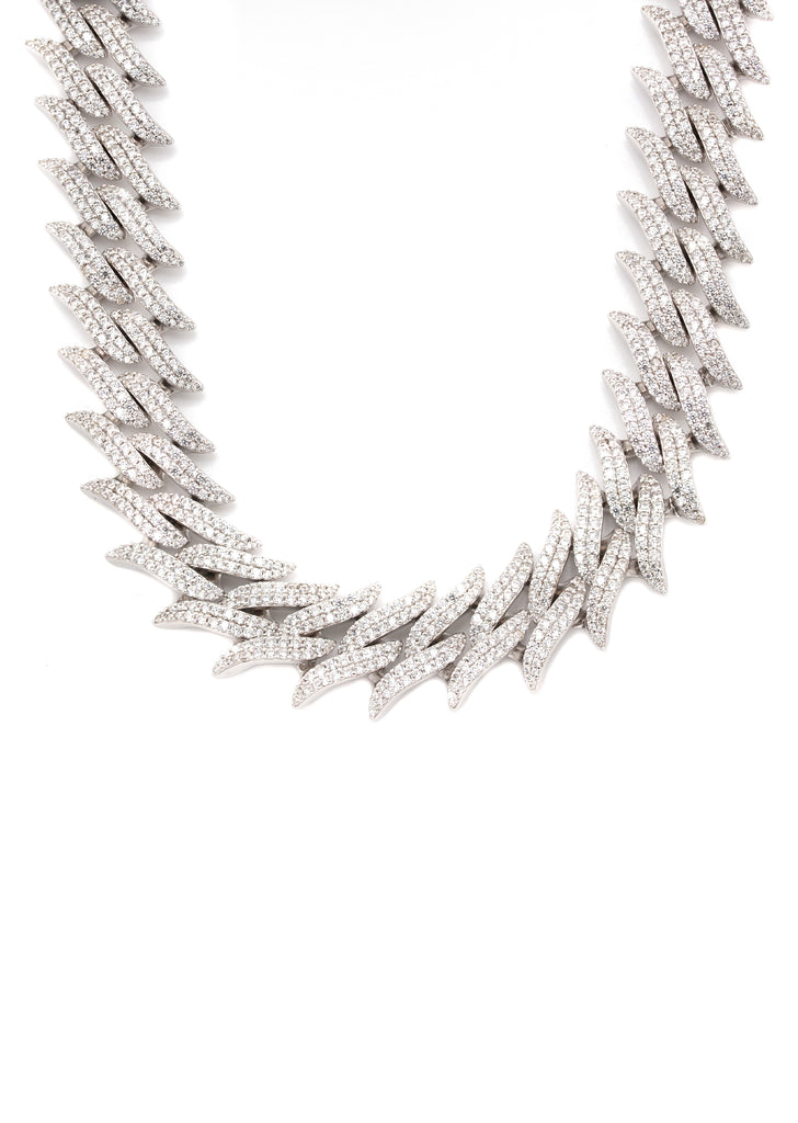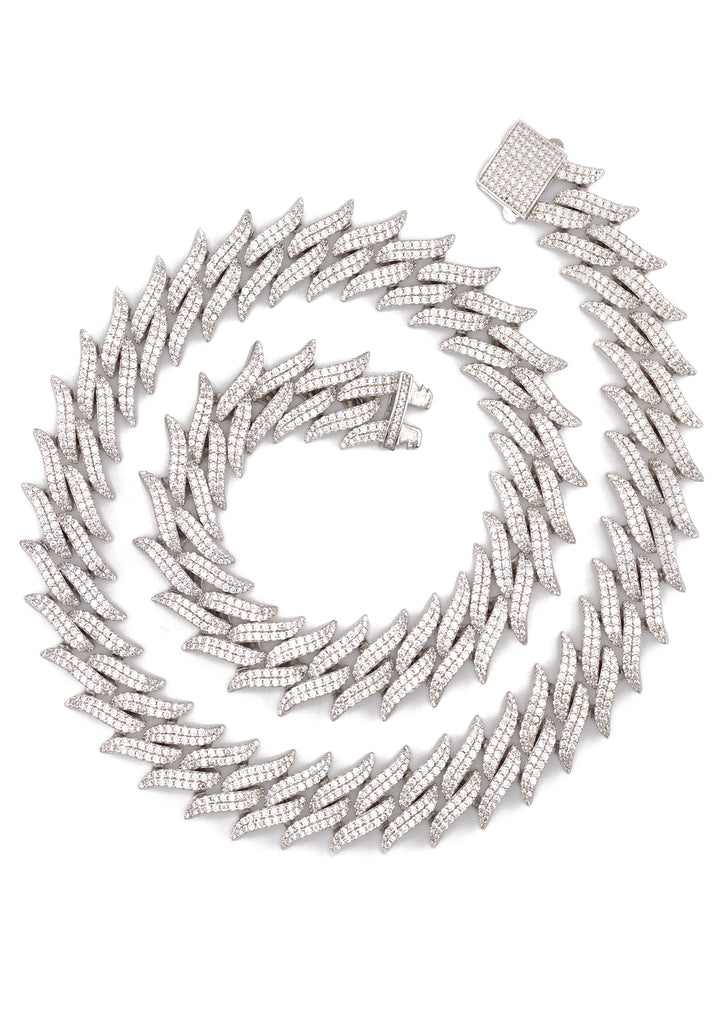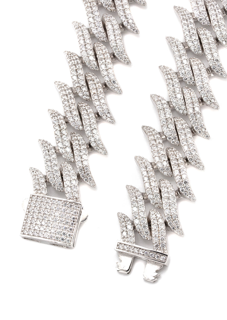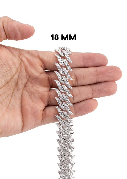 Pure Silver (925) Spike Iced Out Chain in 18 mm width & 22 Inches length, with Rhodium bonded 6 times to provide optimum quality and durability. The chain is also water proof which will provide long lasting wear under any condition.