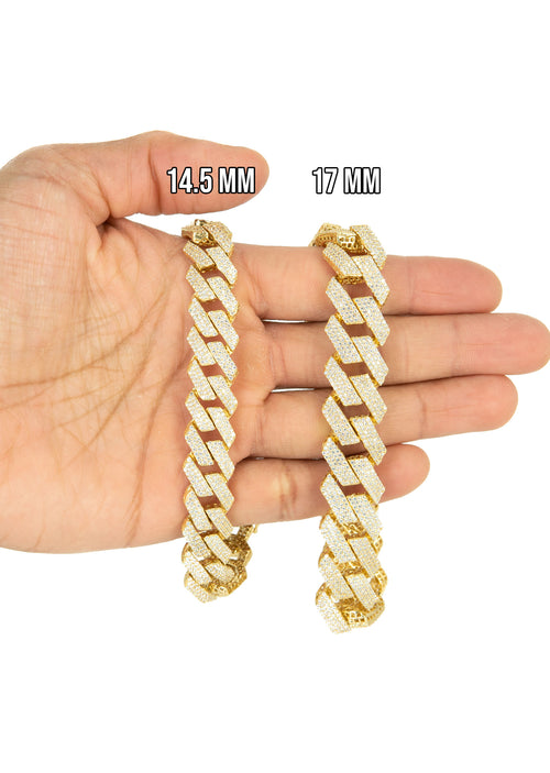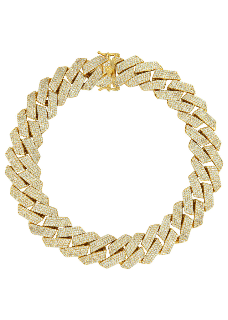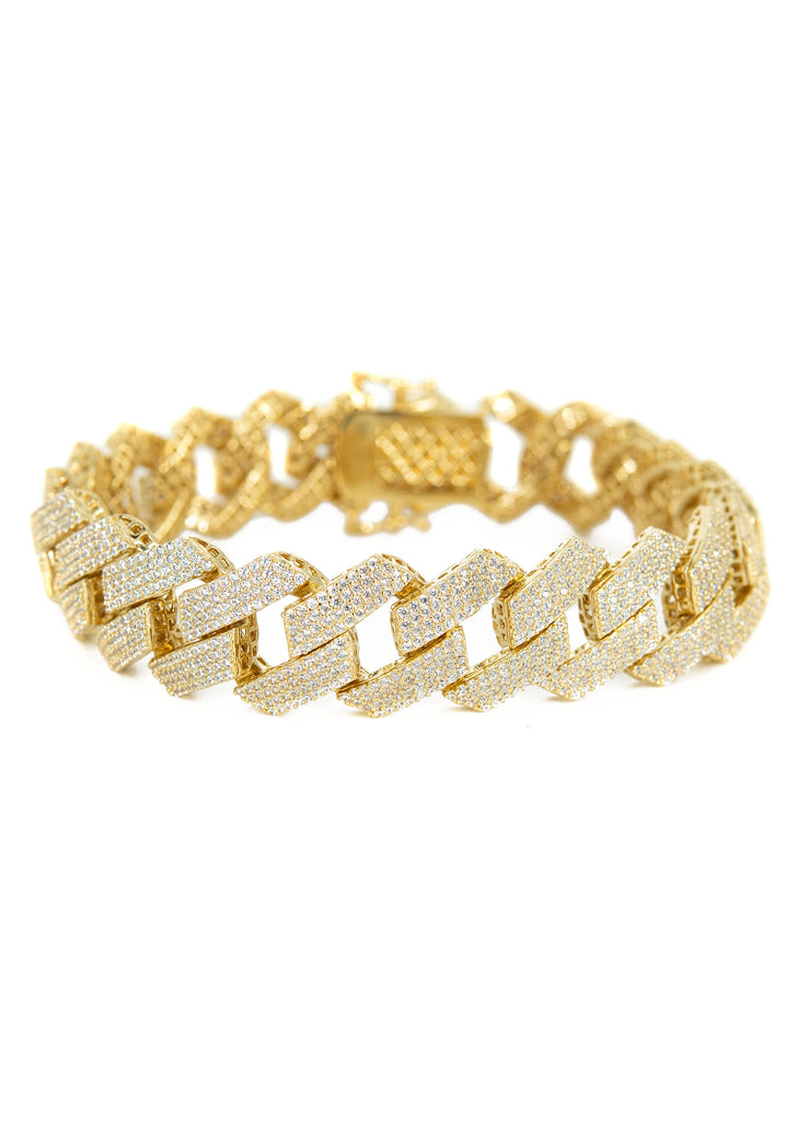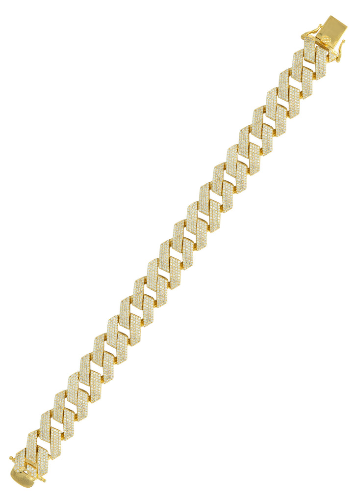 Pure 925 Silver Iced Out Prong Set Bracelet which has been gold bonded over 6 times with 14K Gold for premium quality and durability. These bracelets are fully customizable, so you can pick your length and width above. Once you select your length and width, you can see the adjusted gram weight below the price.