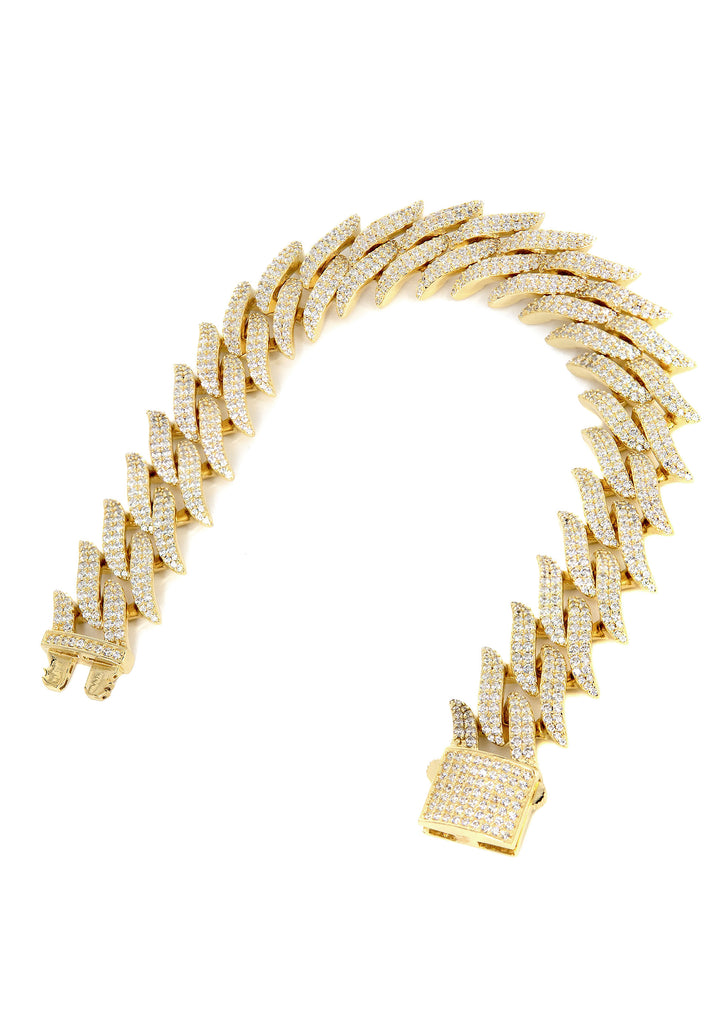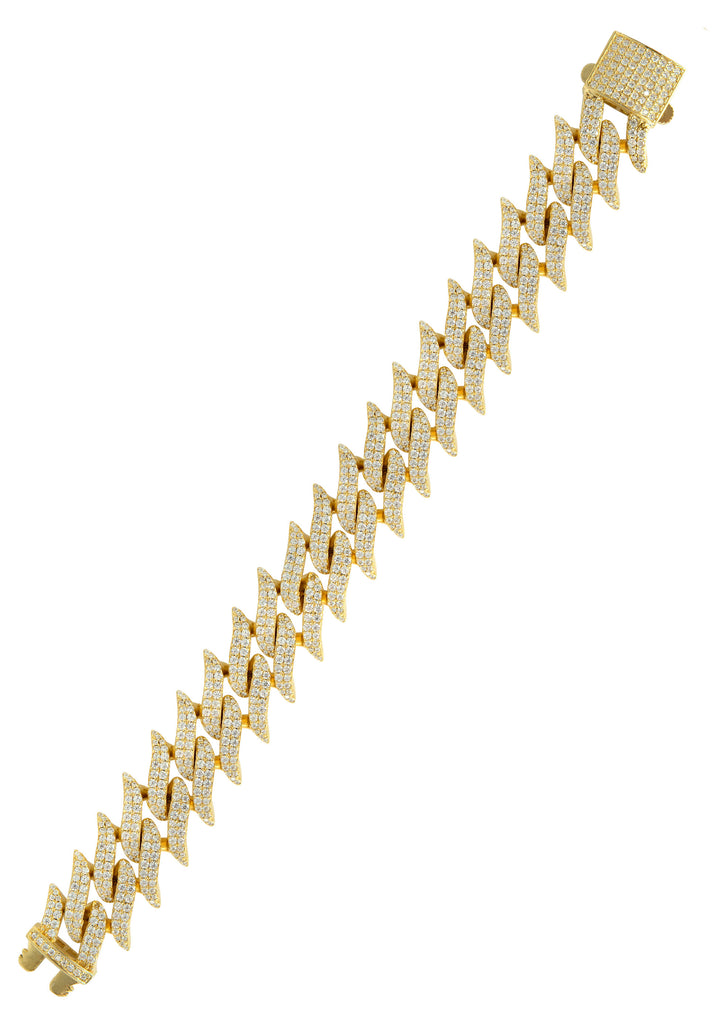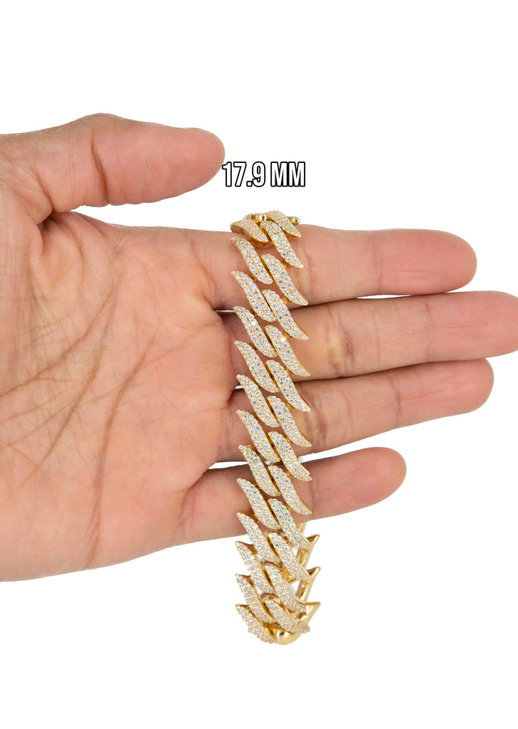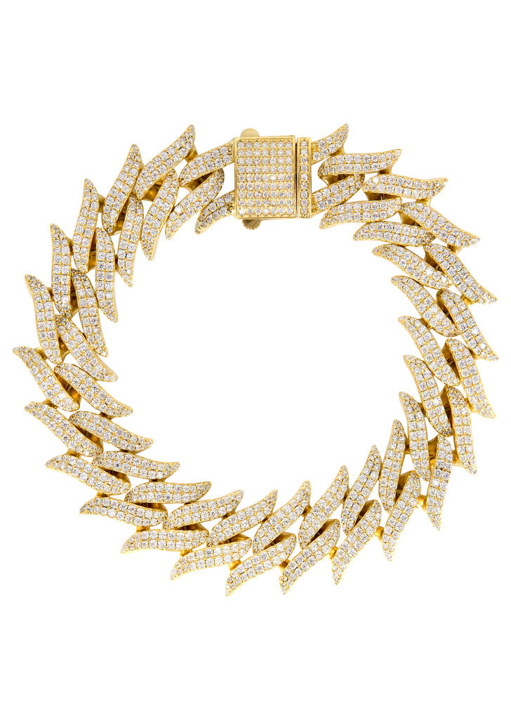 Pure 925 Silver Iced Out Spiked Barbed Wire Bracelet which has been gold bonded over 6 times with 14K Gold for premium quality and durability. These bracelets are fully customizable, so you can pick your length and width above. Once you select your length and width, you can see the adjusted gram weight below the price.