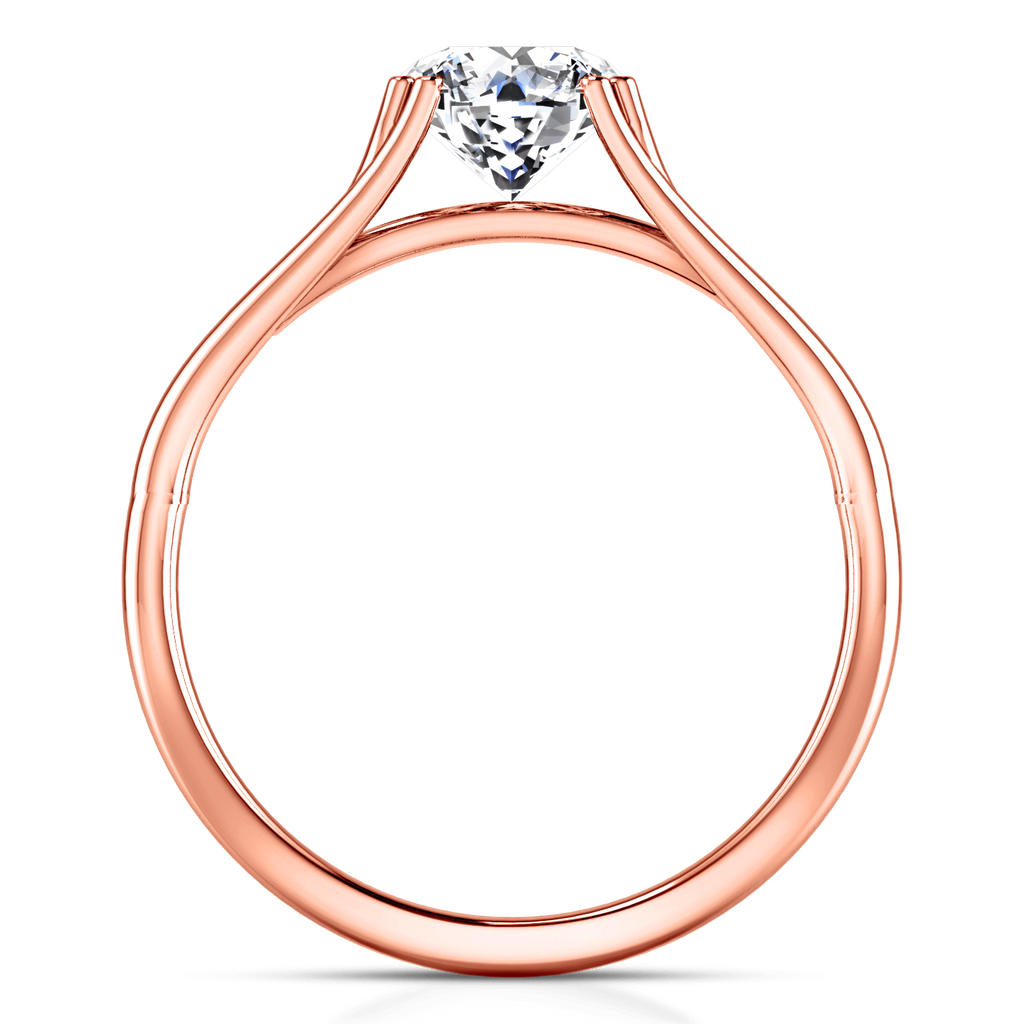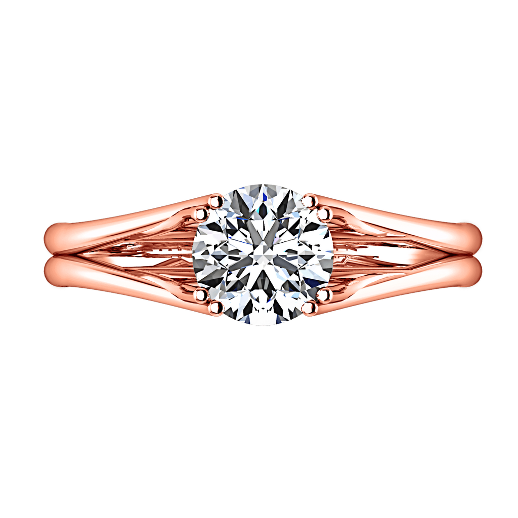 This ring has a unique and delicate look, the setting features a split shoulder mount with the look of double prongs. Featured in 14k rose gold with an average width of 2.5mm . This ring is fully customizable, so pick your center diamond size, color and clarity and we will custom build it for you.