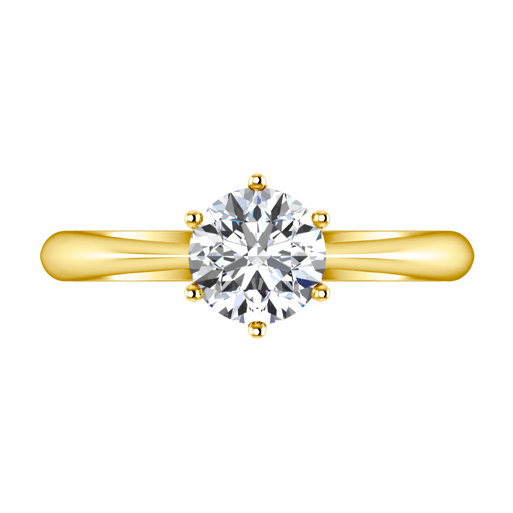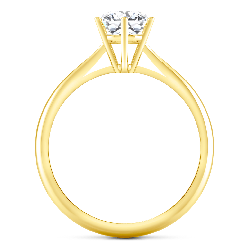 Classic and feminine this ring setting has a six prong basket head with gently tapered shoulders. Featured in 14k yellow gold with an average width of 2mm . This ring is fully customizable, so pick your center diamond size, color and clarity and we will custom build it for you.