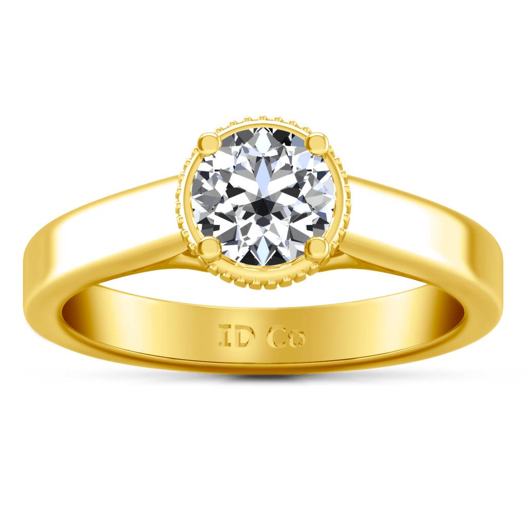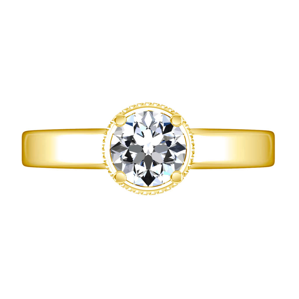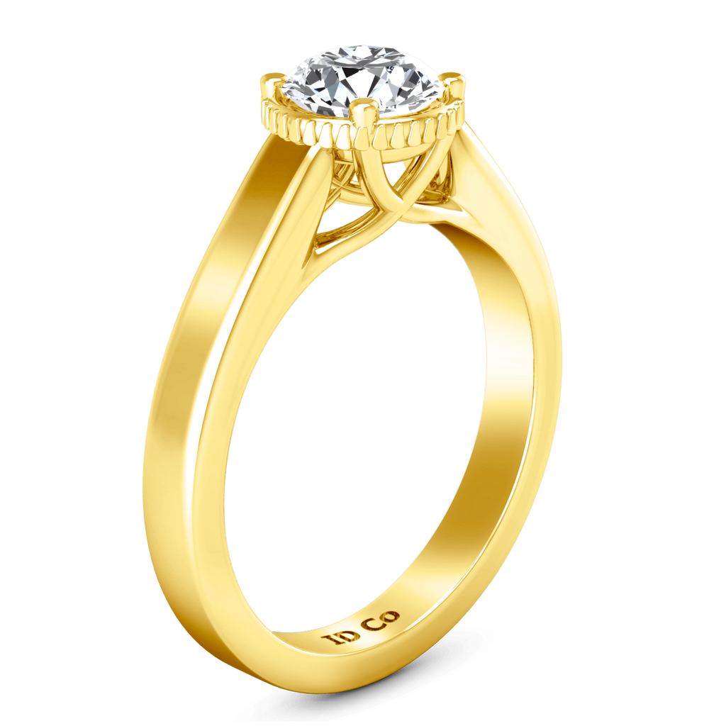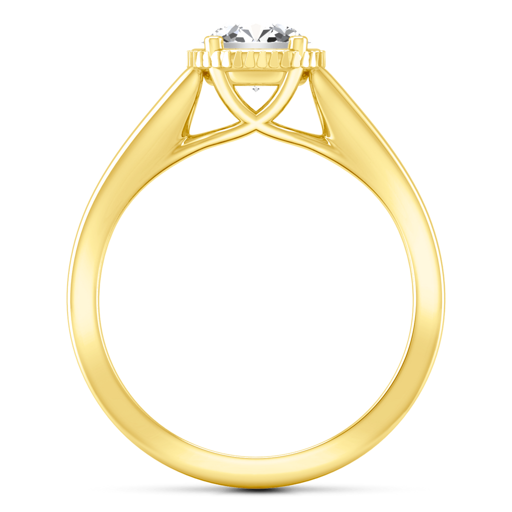 This ring looks both contemporary and romantic with the lattice mount and faux bezel design. Featured in 14k yellow gold with an average width of 2.5mm . This ring is fully customizable, so pick your center diamond size, color and clarity and we will custom build it for you.