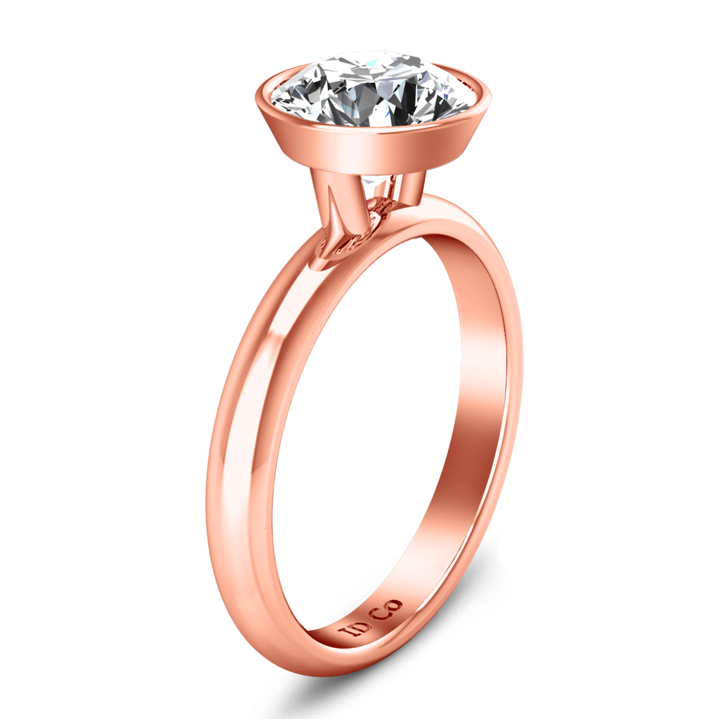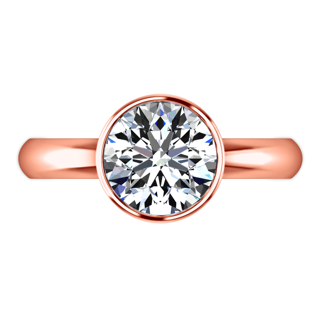 With its clean modern look this ring features a bezel setting to show off your gorgeous diamond. Featured in 14k rose gold with an average width of 2mm . This ring is fully customizable, so pick your center diamond size, color and clarity and we will custom build it for you.