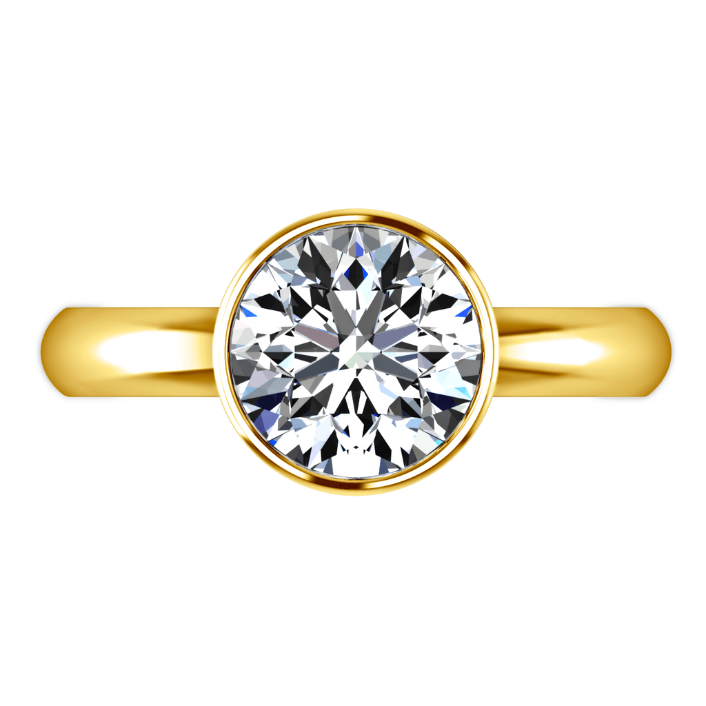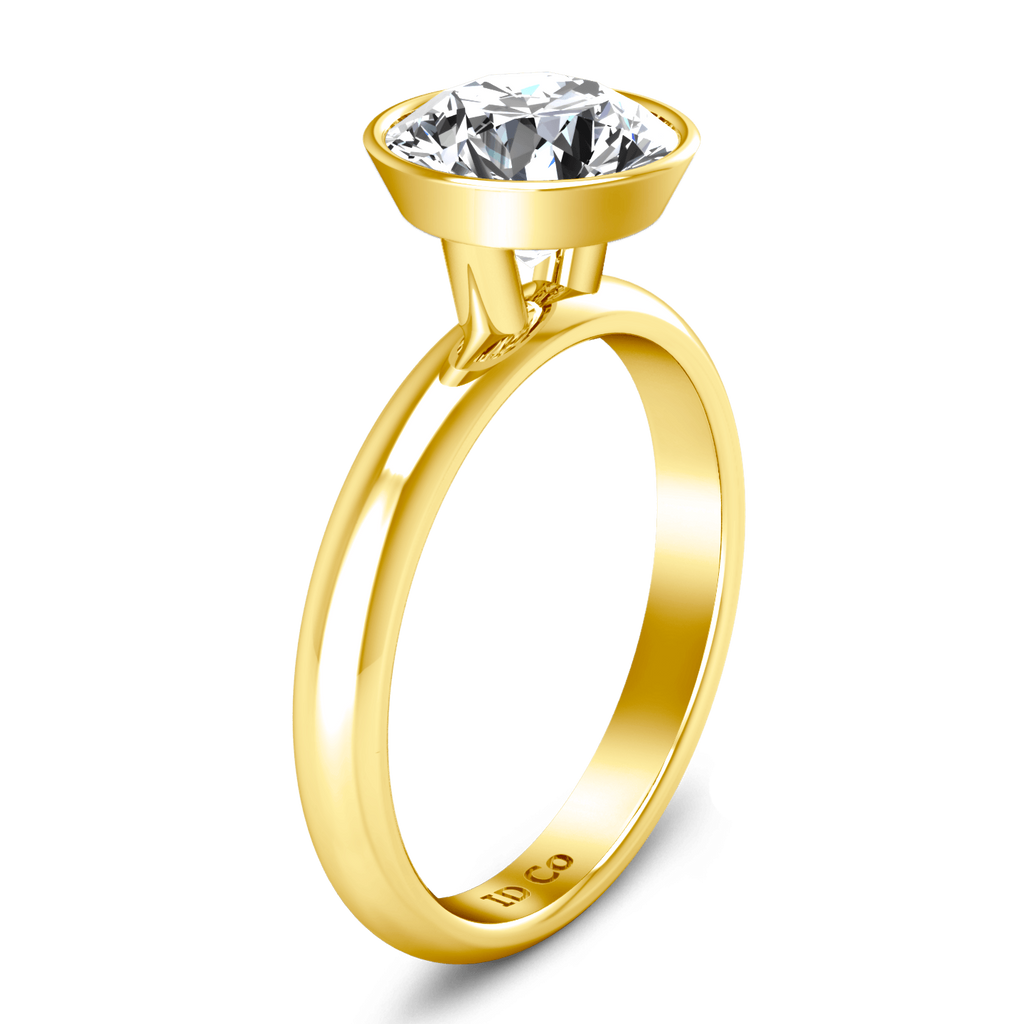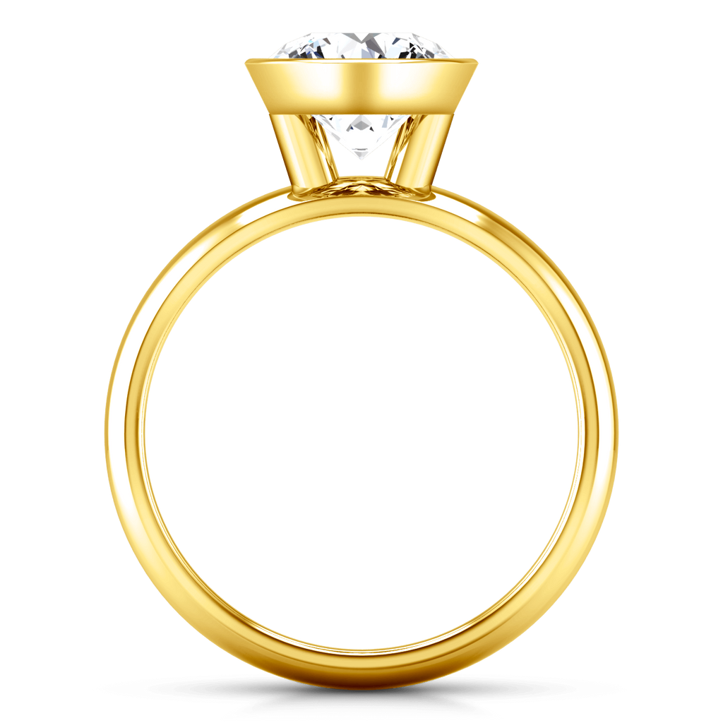 With its clean modern look this ring features a bezel setting to show off your gorgeous diamond. Featured in 14k yellow gold with an average width of 2mm . This ring is fully customizable, so pick your center diamond size, color and clarity and we will custom build it for you.