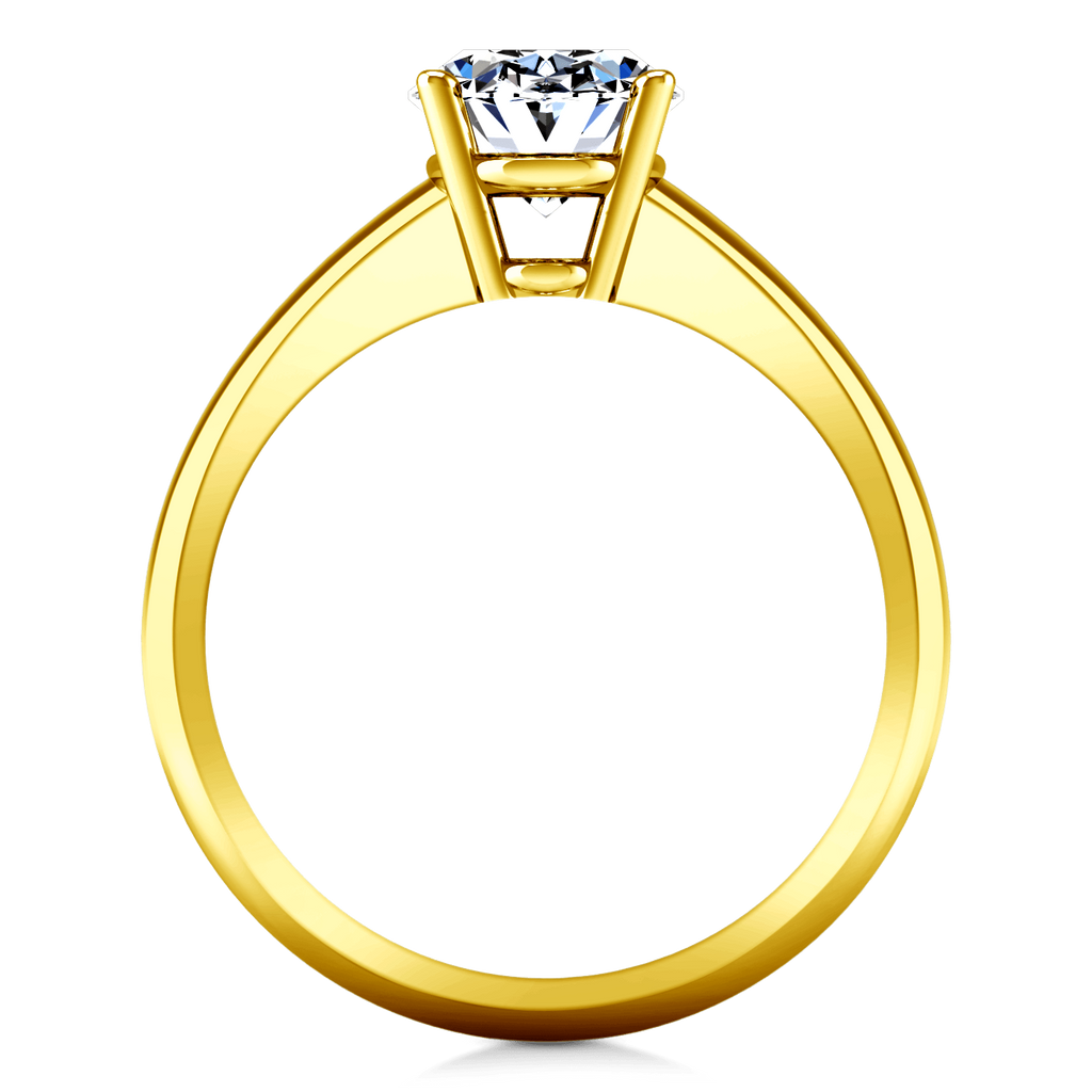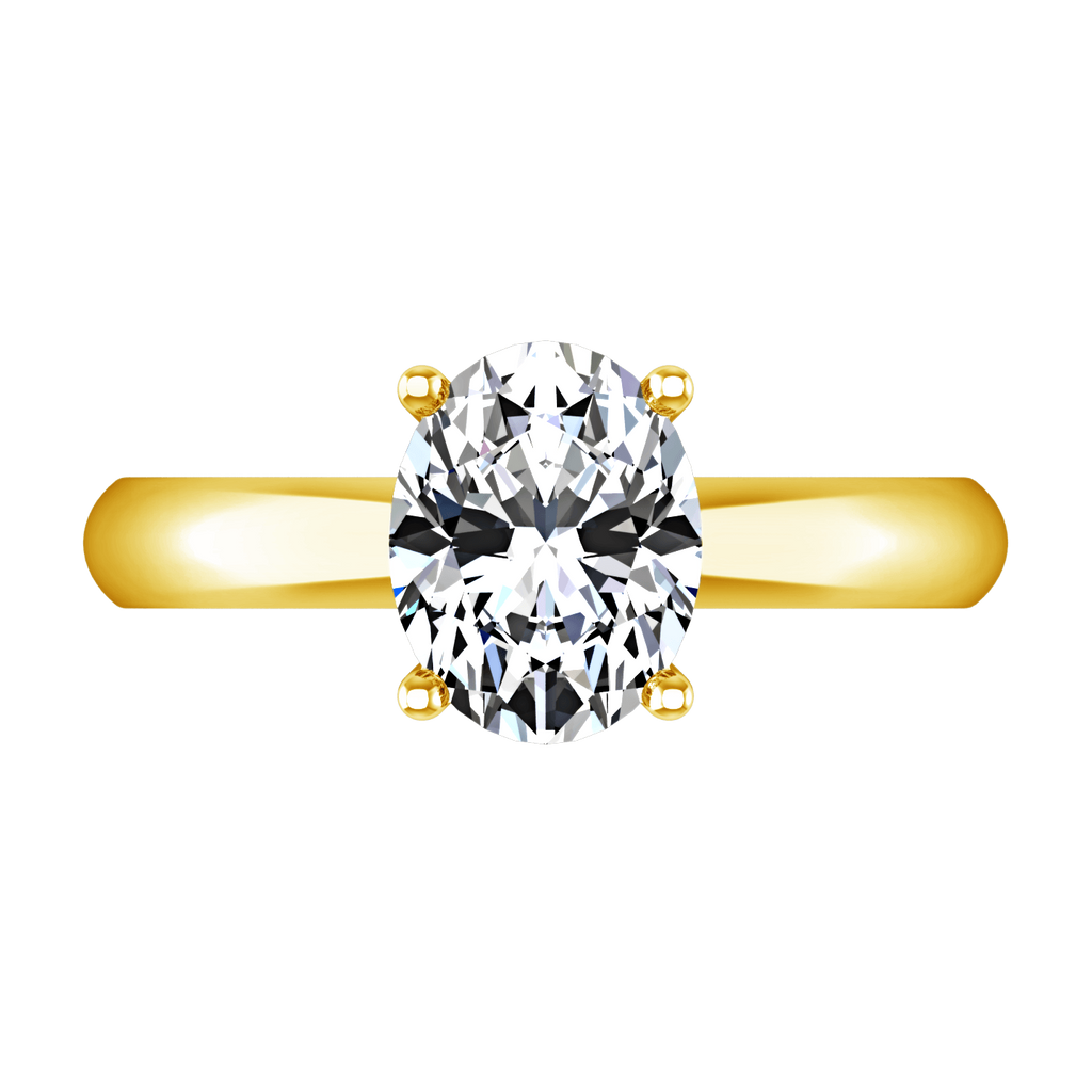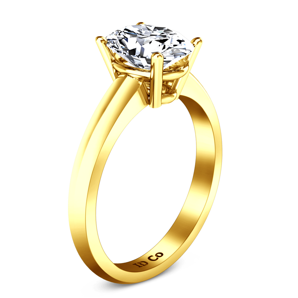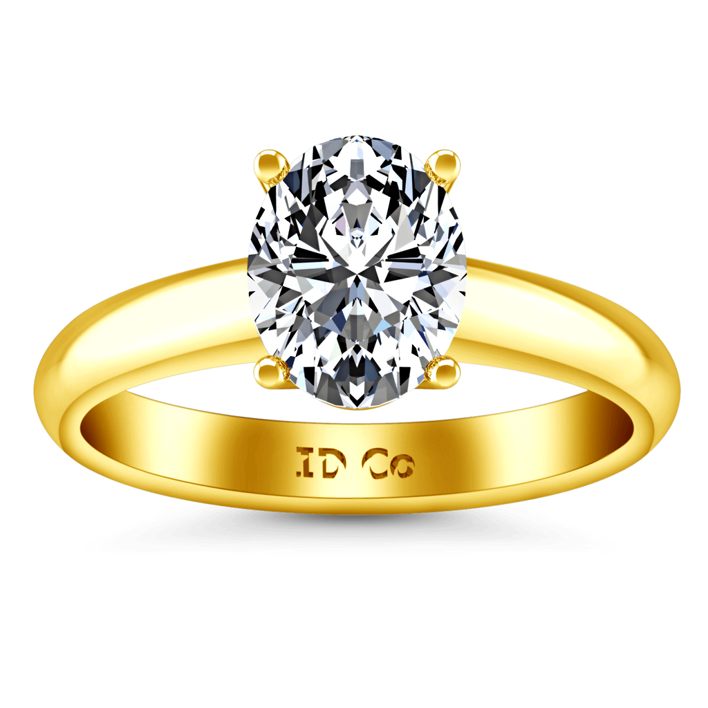 Solitaire engagement ring for the oval shape diamond with rounded edges to create comfort for everyday wear. Featured in 14k yellow gold with an average width of 2mm .