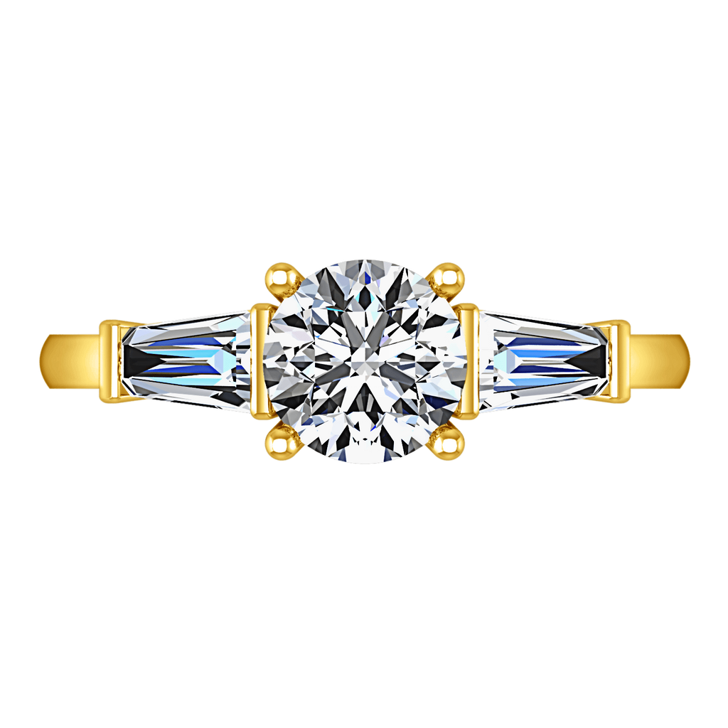 Always a classic, tapered baguettes are set flanking your scintillating center stones in this beautiful diamond engagement ring. Featured with 0.14 carats of side diamonds in 14k yellow gold with an average width of 2mm . This ring is fully customizable, so pick your center diamond size, color and clarity and we will custom build it for you.