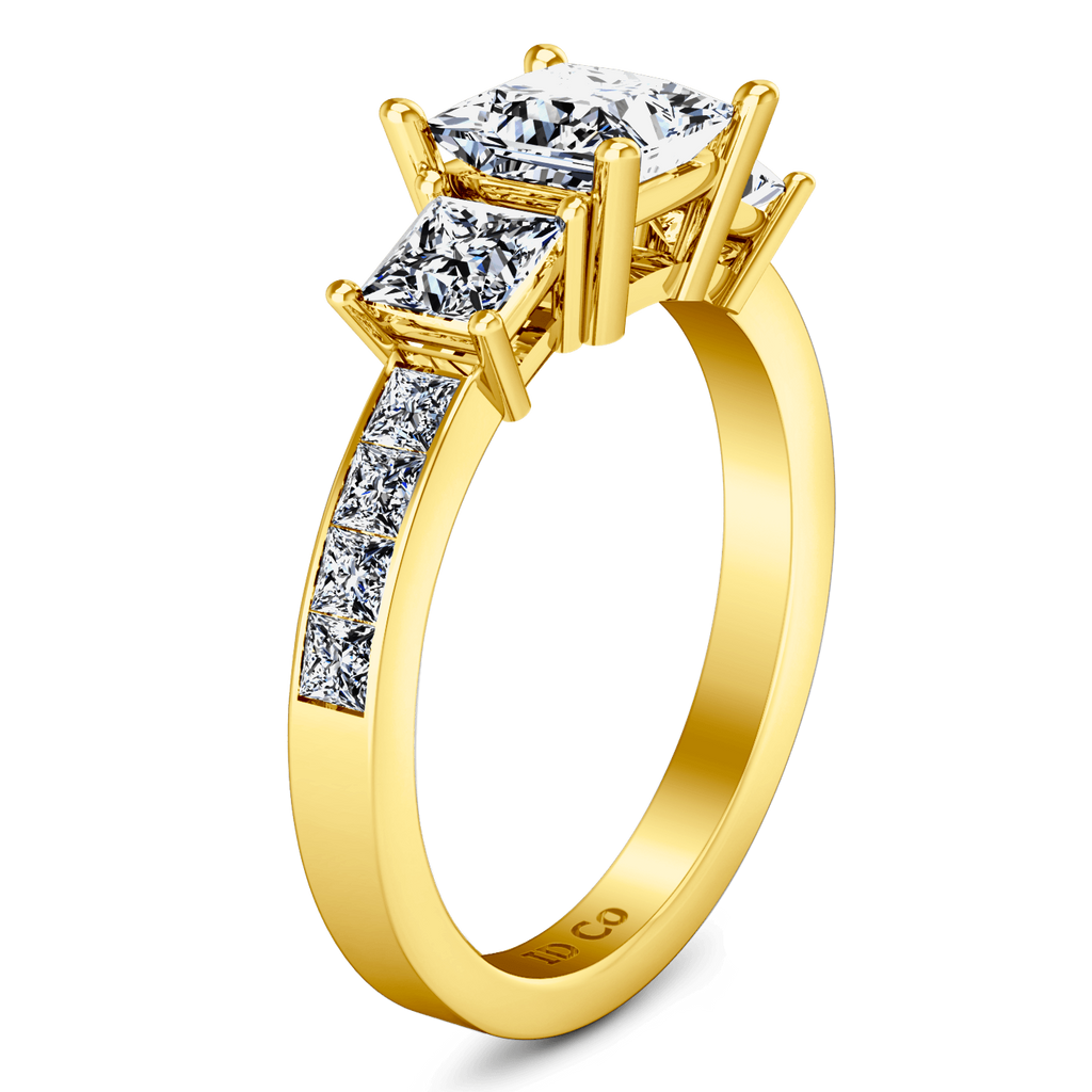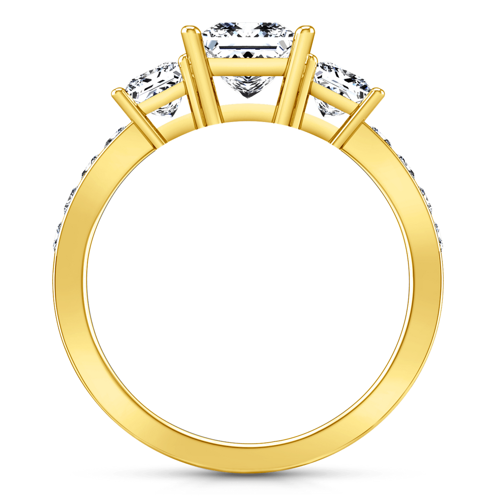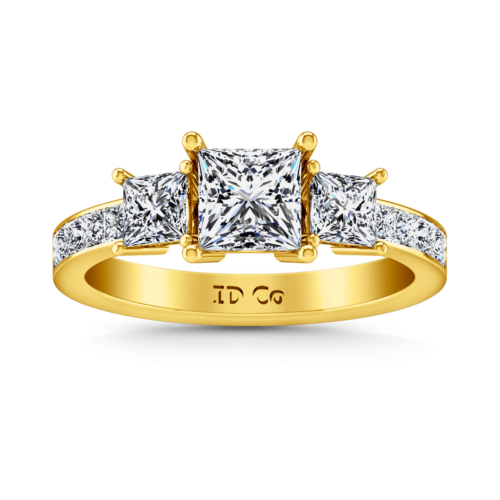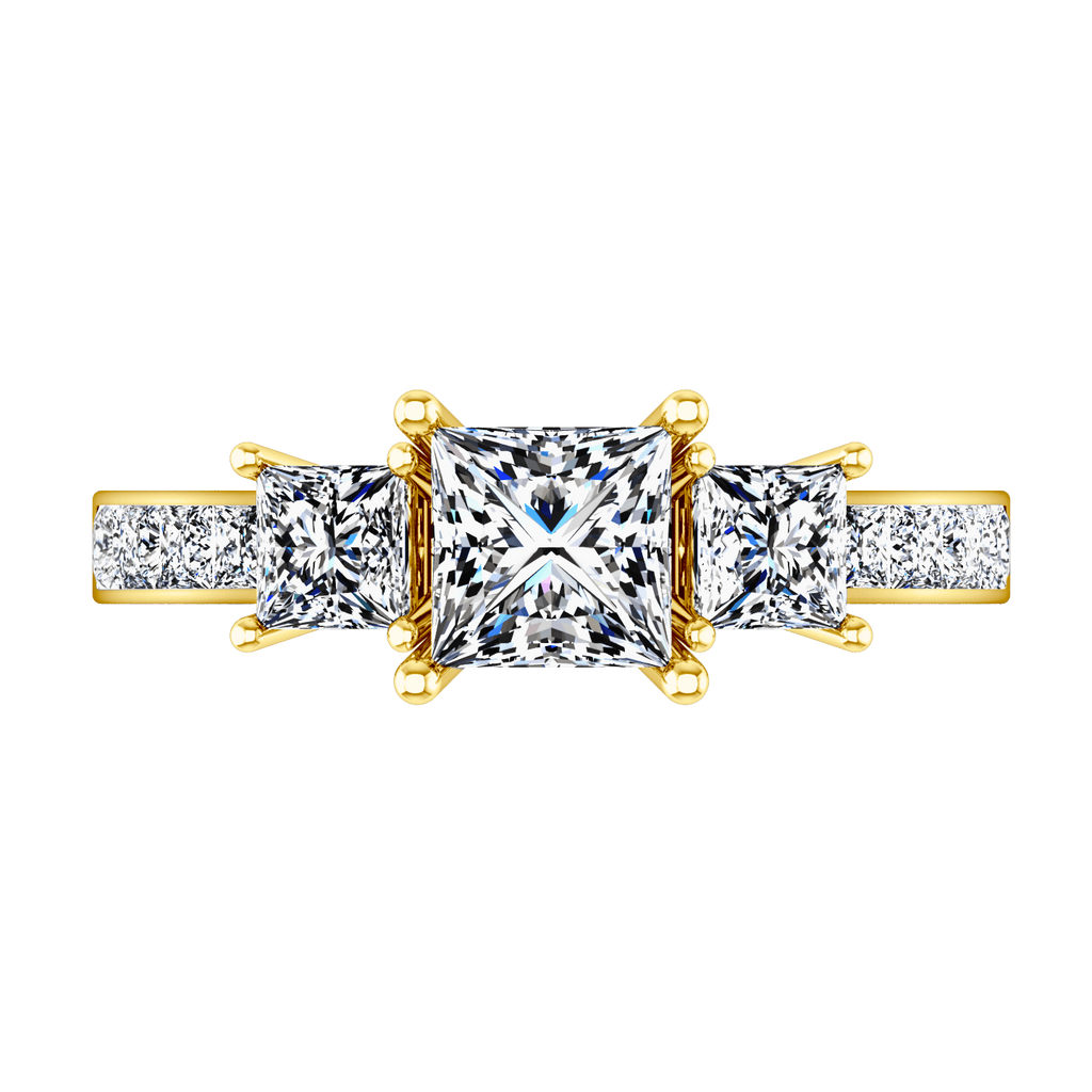 A classic Three Stone ring that will last an eternity, featuring two princess side stones on each side luminating the center princess cut diamond. Featured with 0.44 carats of side diamonds in 14k yellow gold with an average width of 2mm . This ring is fully customizable, so pick your center diamond size, color and clarity and we will custom build it for you.