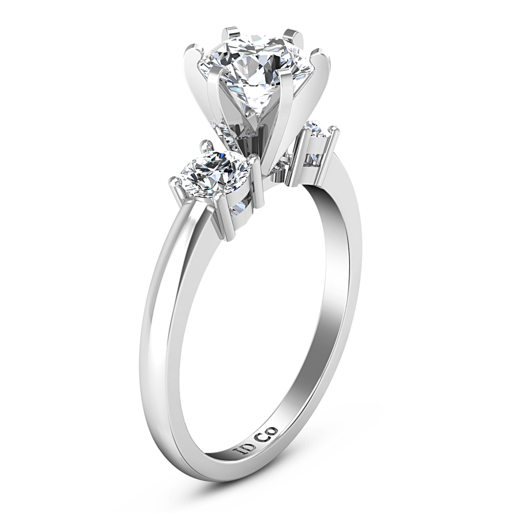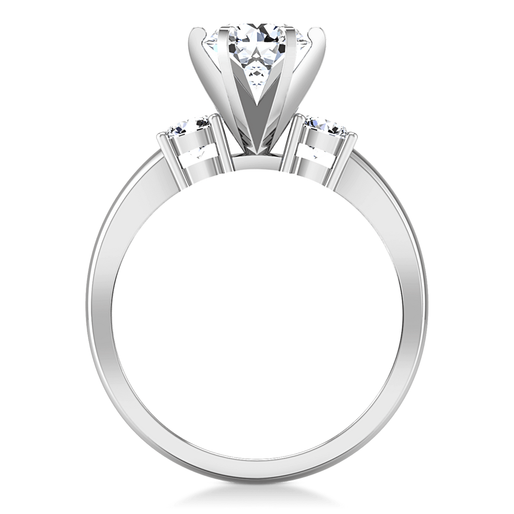 Always cherish your Past , Present & Future with this classic and elegant three stone style engagement ring set with two brilliant cut diamonds that hightlight the center stone. Featured with 0.4 carats of side diamonds in 14k white gold with an average width of 2mm . This ring is fully customizable, so pick your center diamond size, color and clarity and we will custom build it for you.