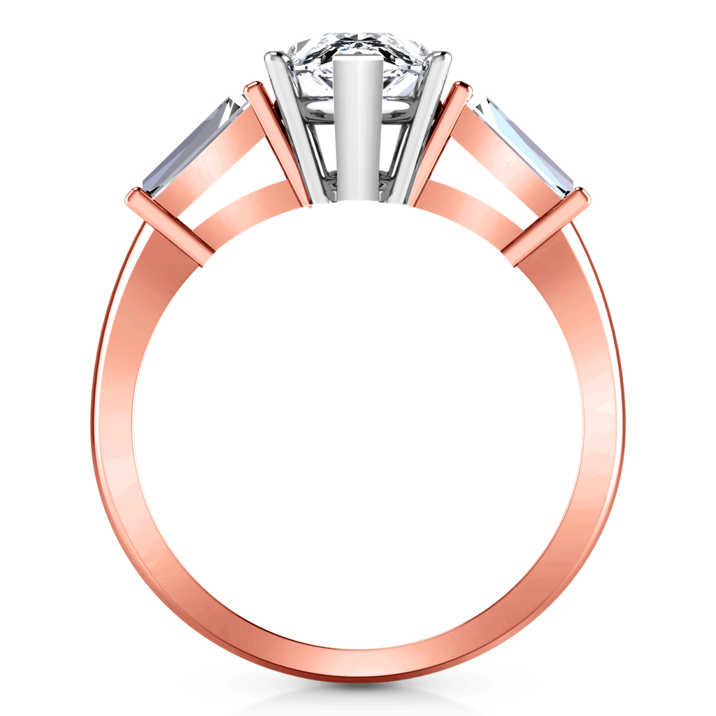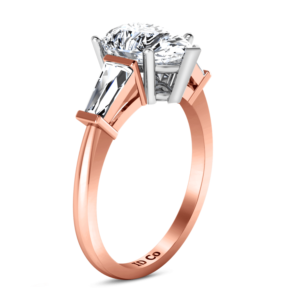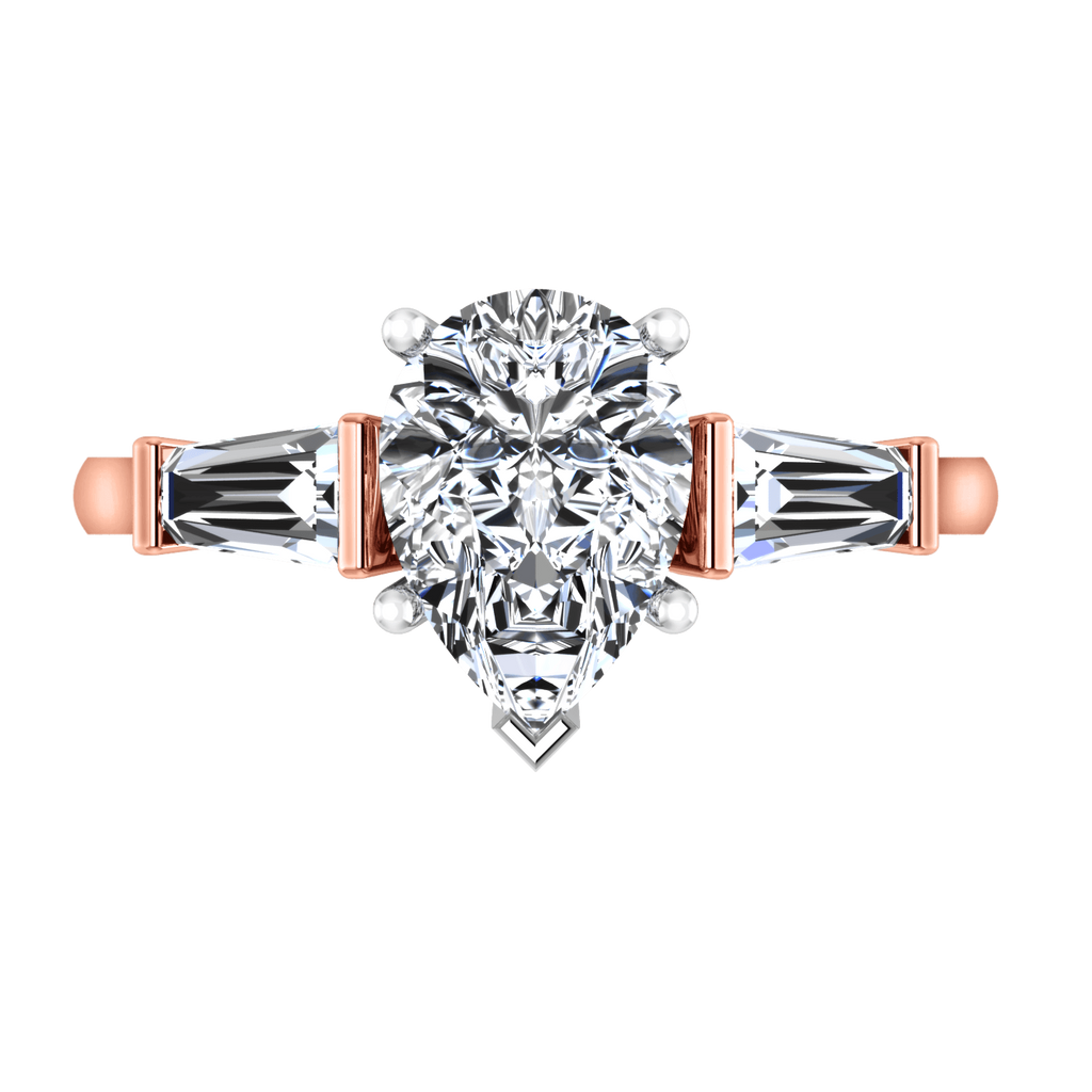 This setting features classic tapered baguettes side stones that frame your pear shaped center diamond. Featured with 0.24 carats of side diamonds in 14k rose gold with an average width of 2mm . This ring is fully customizable, so pick your center diamond size, color and clarity and we will custom build it for you.