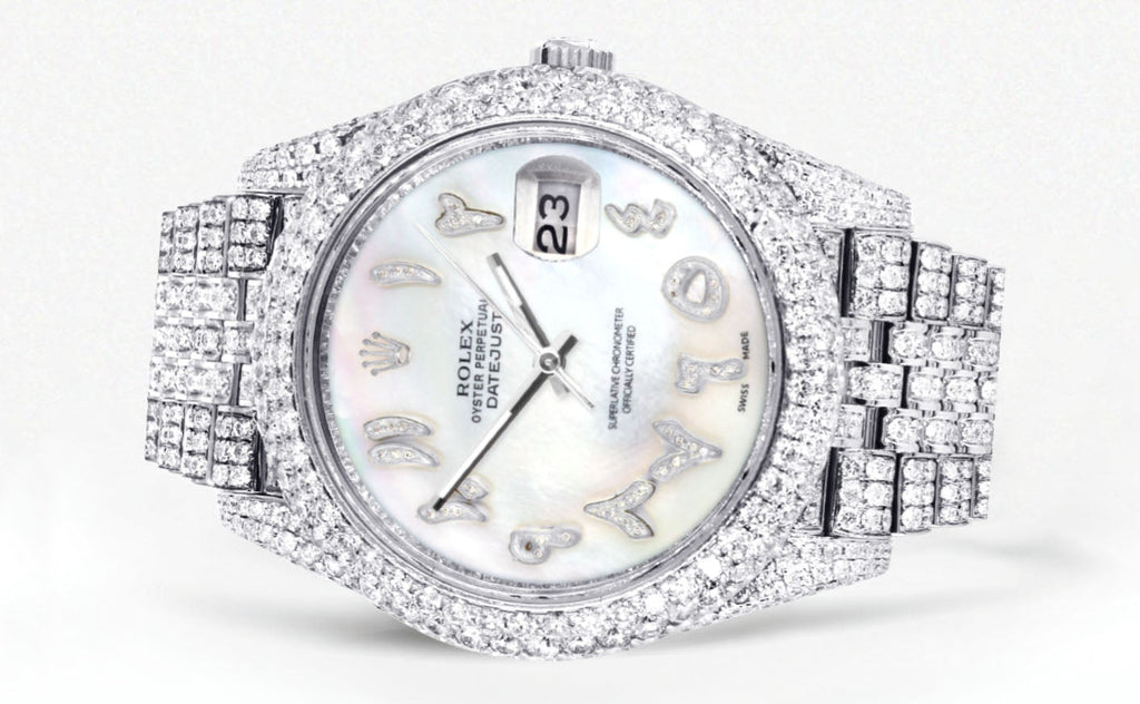 Womens Diamond Iced Out Rolex Datejust 41 | 25 Carats Of Diamonds | Custom Mother of Pearl Arabic Numeral Diamond Dial | Two Row | Jubilee Band