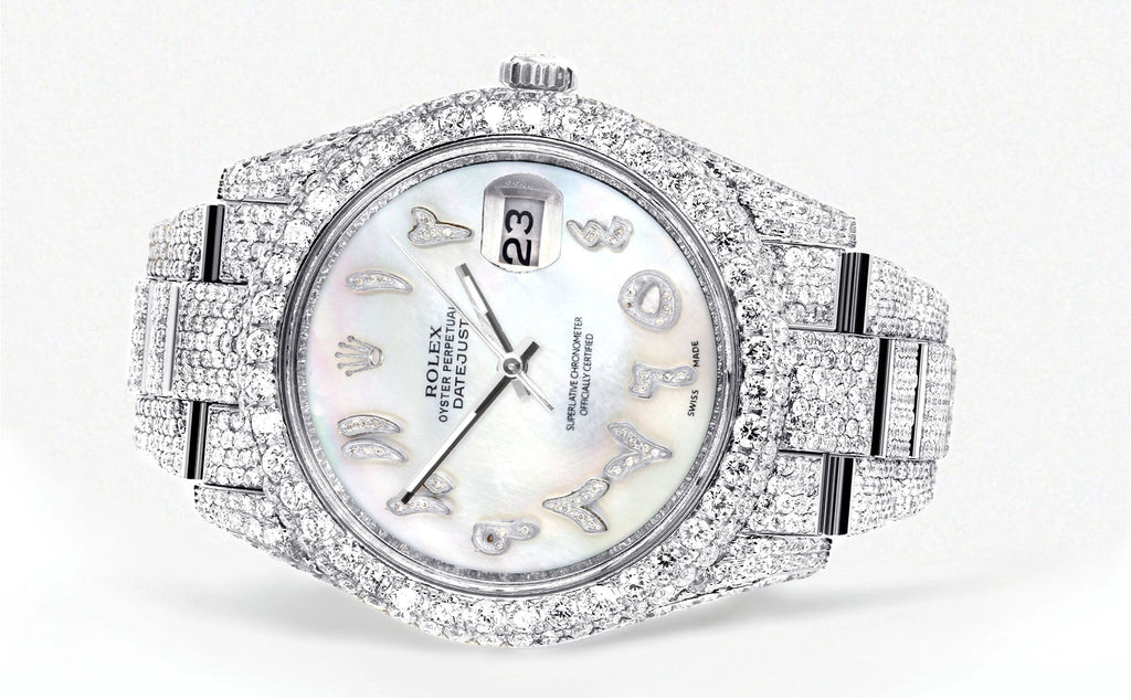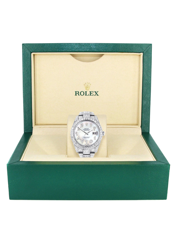 Womens Diamond Iced Out Rolex Datejust 41 | 25 Carats Of Diamonds | Custom Mother of Pearl Arabic Numeral Diamond Dial | Two Row | Oyster Band