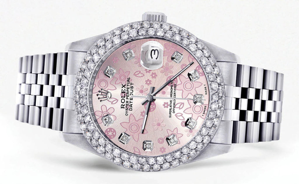 Womens Rolex Datejust Watch 16200 | 36Mm | Pink Flower Dial | Two Row 4.25 Carat Bezel | Jubilee Band